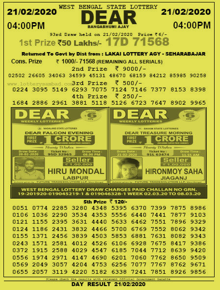 West Bengal Lottery Dear Banga Bhumi Ajay Results 28 02 2020 Draw Live Lottery Results All World Lottery Draws 2021 Winners - Dear bangabhumi ajay is a popular weekly lottery organised by the west bengal state lottery department every friday.