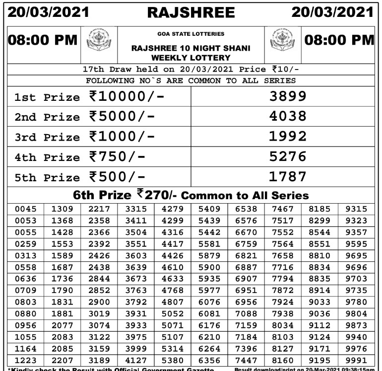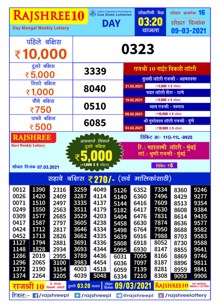 Goa Rajshree 10 Lottery Result Goa Rajshree 10 Lottery Result - Goa lottery and its related lottery like golden lottery is very popular in goa.