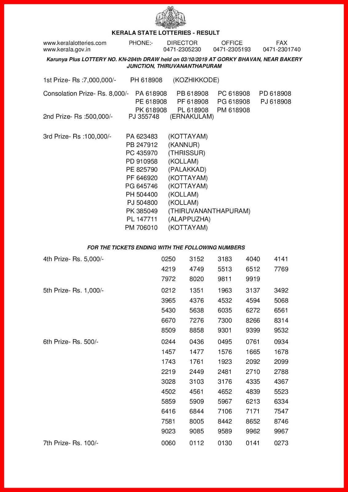 Live Kerala Lottery Result 03 10 2019 Karunya Plus Kn 284 Lottery Result Off Kerala Lottery Today Result 6 4 2021 - We are a promotional website of kerala lotteries, we are also providing other unique lottery result services such as, register a kerala lottery ticket and get winning alert in email, automated online we are providing the result in html format as well as the pdf link to the official lottery result link.