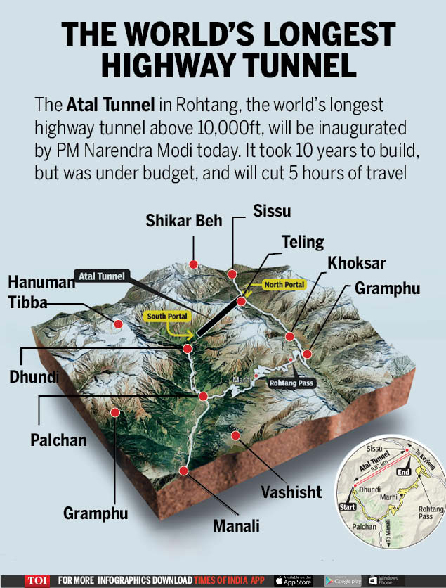 Atal Tunnel World S Longest Highway Tunnel Above 10 000ft Inaugurated India News Times Of India - Atal tunnel (previously known as rohtang tunnel), named after former indian prime minister atal bihari vajpayee, is a 2 at 8.8 km (5.5 mi) length, the tunnel will be one of the longest road tunnels in india and is expected to reduce the distance between manali and keylong by about 46 km (28.6 mi).